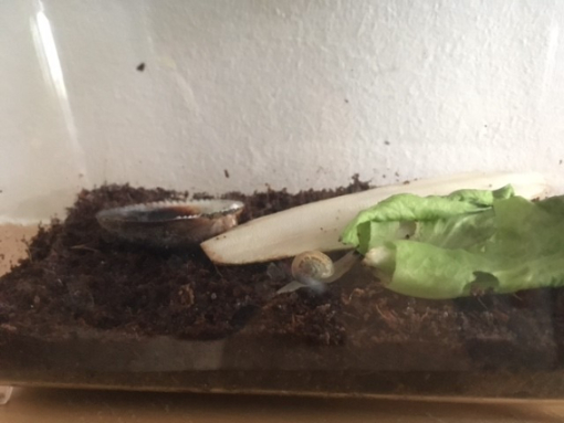 Der Überlebenskünstler heißt seitdem Valentino und wir haben ihm am nächsten Tag ein Micro-Terrarium gekauft, da Aussetzen der sichere Tod gewesen wäre. Er hat manchmal wochenlang regungslost an der Unterseite eines Salatblatts geklebt, aber ist immer wieder aufgewacht und weitergewachsen.