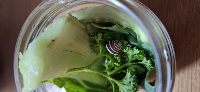 Ich habe heute eine Schnecke in meinem Gemüsefach gefunden und würde ihr gerne helfen. Zum Übergang habe ich ihr ein kleines Airbnb im Gurkenglas eingerichtet, natürlich mit Wasserstelle (wenig Wasser) und Gurken. Wir haben hier -7 Grad und ich würde sie gerne hier behalten. Mir scheint es auch so als würde die Schnecke keine einheimische Schnecke sein, da ich so eine noch nie gesehen habe.