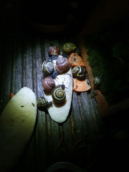 Mein Balkon ist kein Ort für eine Laubschnecke, denke ich, es gibt auch keine Artgenossen. Leider ist der Vorgarten sehr sandig und trocken, nicht ideal und die Taglilie wohnt jetzt auch nicht mehr dort. Aber darüber thront ein Baum, ein Eschenahorn mit hellem Laub, Südseite. Am Ende meines Balkons steht ein Ahorn mit dunklem Laub, Nordseite.
