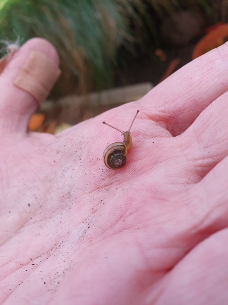 Heute habe ich mich einer Taglilie angenommen, die im Vorgarten ein karges Leben führte. Auf meinem Balkon setzte ich die Pflanze in neue Erde und einen eigenen Blumentopf. Beim abbrausen der Erde von den Blättern fiel mir ein brauner Fleck auf, der sich nicht wegspülen ließ. Bei genauerem Hinsehen entdeckte ich ein Minischneckchen. Ein Laubschneckchen?