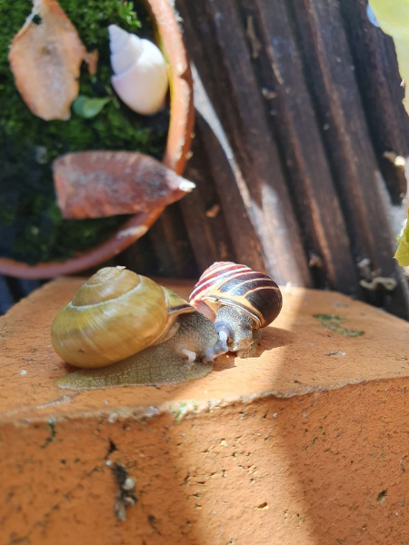 Die Sterblichkeitsrate scheint sehr gesunken zu sein, ich finde kaum noch leere Schneckenhäuser. Die Schneckis verstecken sich in der Nähe der Futterstellen und versammeln sich dann abends oder bei Regen dort.