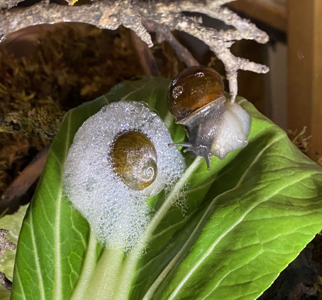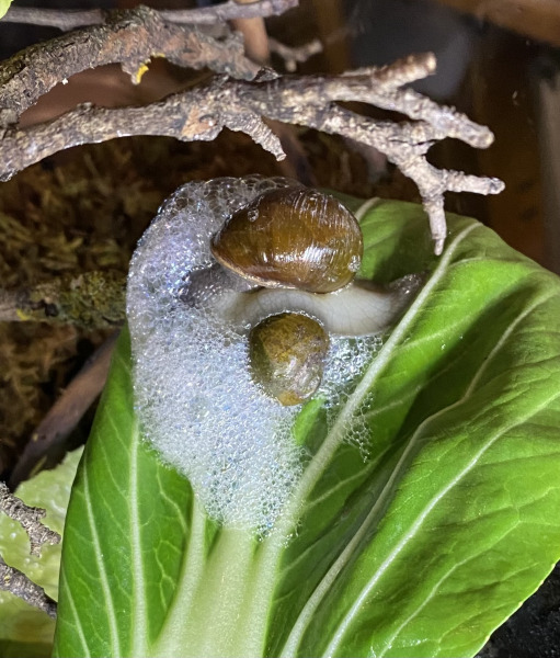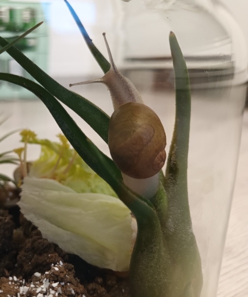 Die Unterbringung ist noch nicht optimal: du solltest ihr einen Behälter anbieten, in dem sie sich eingraben kann. Falls sie wirklich eine Grunzschnecke ist, wird sie sich bald eingraben wollen; zwischen den Steinen geht das nicht so gut. Ausserdem kann sie sich beim Herunterfallen verletzen.