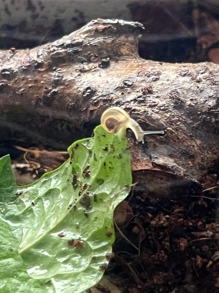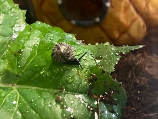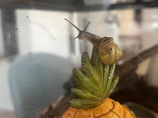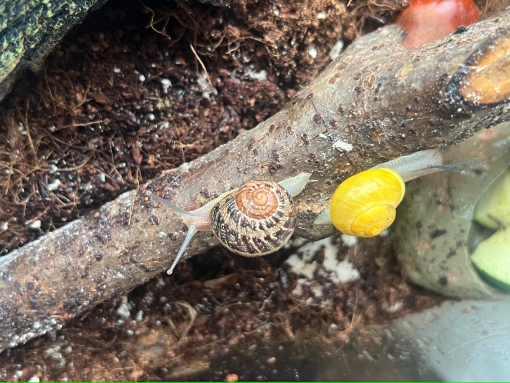Mein Sohn hat vor ca. 2 Monaten ein kleines Kerlchen gefunden, dass nur einen richtigen Fühler hatte sowie ein relativ dünnes, zerbrechliches Häuschen. Wir haben sie mit reingenommen & ein provisorisches Gehege eingerichtet. Mein Sohn hat der Schnecke direkt einen Freund gefunden und dazugesetzt: (Die kleinere auf den Panzer war das erste Fundtier)
